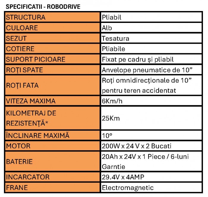 *Autonomie aproximativă, determinată și de greutatea ocupantului, starea bateriei, temperatura ambientală, modul de condus, terenul și viteza vântului. Roți anti-înclinare.